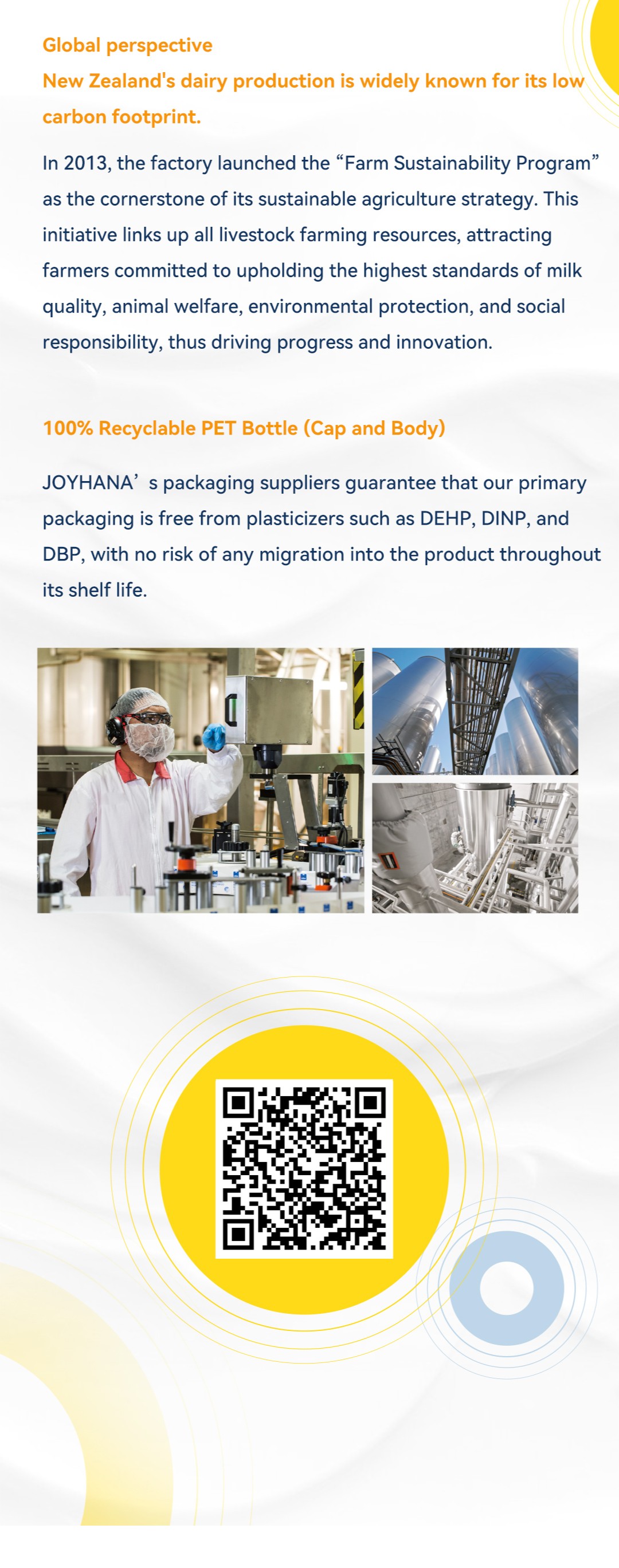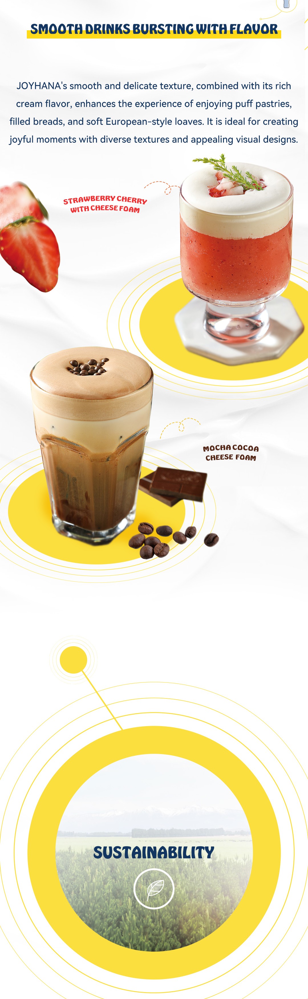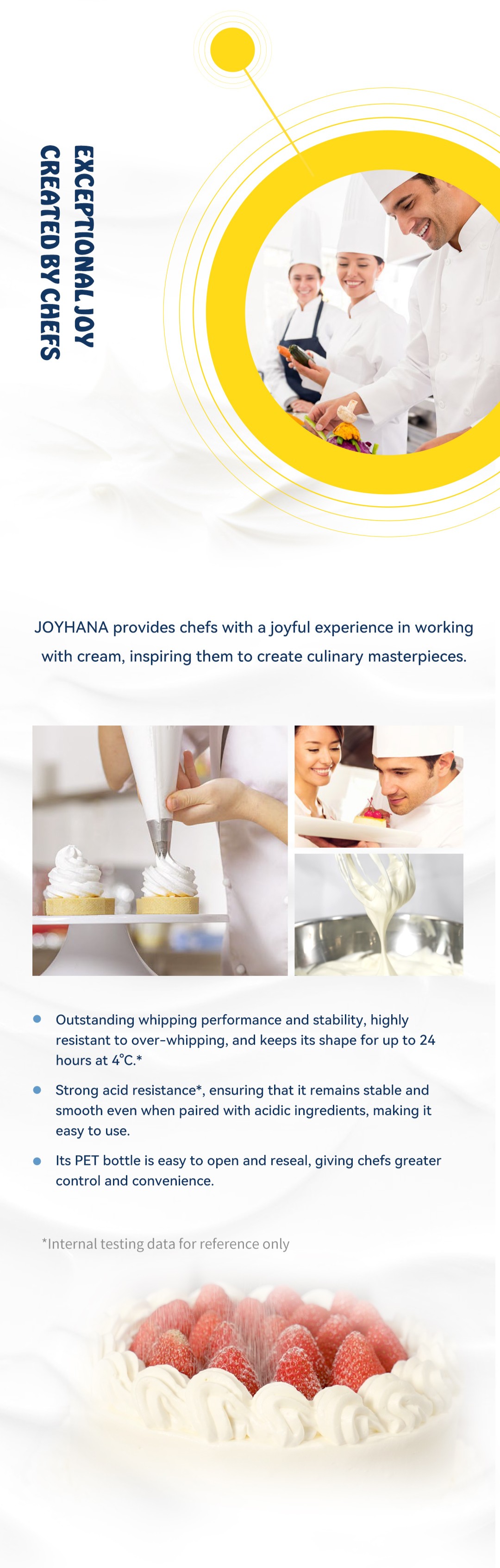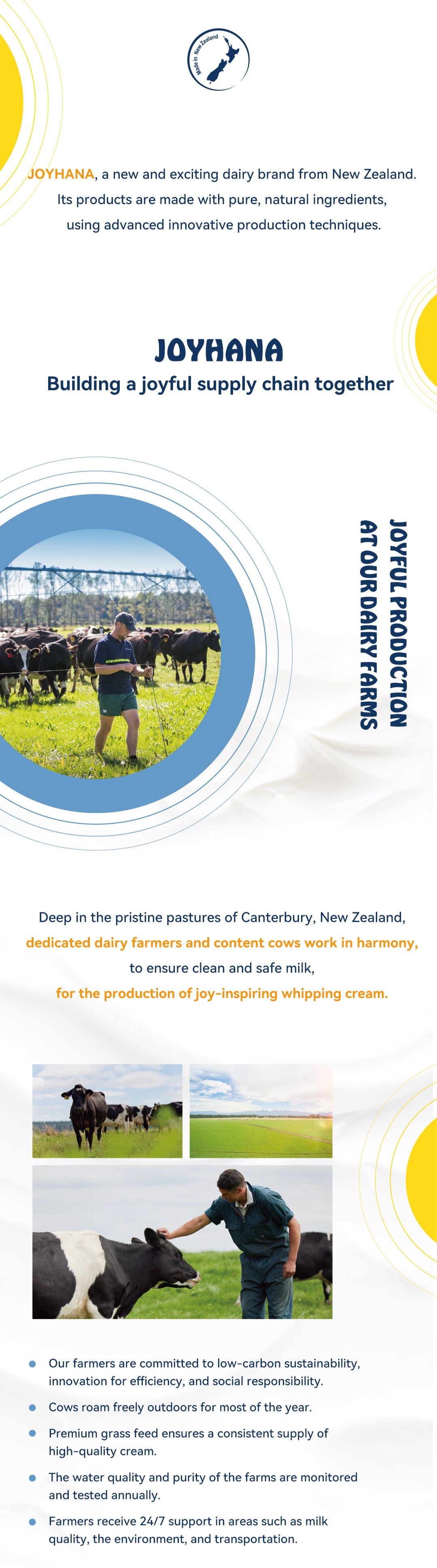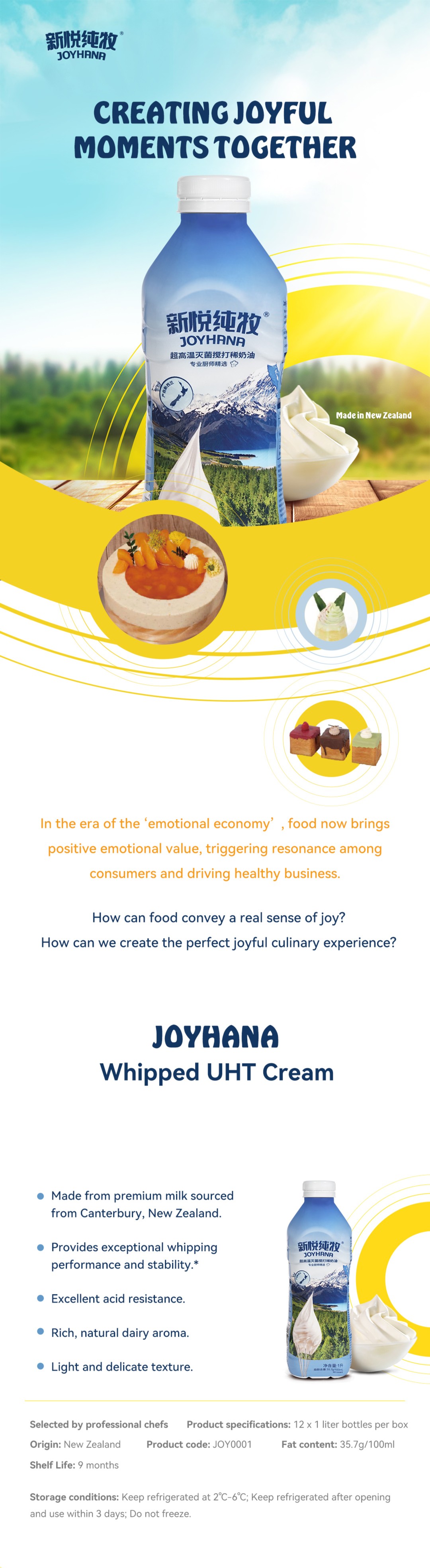 "As chefs, you enrich each day with unique flavors that create genuine moments of joy.At JOYHANA, we share your passion, believing that exquisite cream flavors are crafted through a joyful spirit.We are JOYHANA. We take pride in delivering high-quality dairy products.Our dairy products are sourced from the lush pastures at the foot of the Southern Alps in Canterbury, New Zealand. Our dedicated farmers work tirelessly to care for the grass, nurturing healthy cows that produce exceptional milk. Here, dairy farmers and workers enjoy a comfortable working environment and training, taking pride in their ability to create truly superior cream. Equipped with advanced, innovative production lines, we focus on producing delicious, high-quality cream, helping every chef experience the joy of creating masterpieces.We understand your pursuit of perfection in your work and the pride you feel when your culinary creations bring joy to others. Like you, we recognize that high-quality dairy products are essential for crafting successful dishes. Therefore, we strive for excellence in production, ensuring that you can enjoy creating while pursuing perfection.JOYHANA - CREATING JOYFUL MOMENTS TOGETHER!"