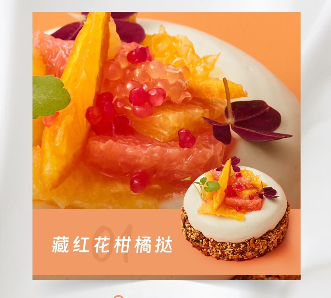 Alexis Beaufils将豆蔻、藏红花浸泡萃取于爱乐薇轻脂稀奶油,融入柑橘类水果的清新酸度,并搭配谷物脆饼,制成一款兼具清新与松脆口感的甜点。
