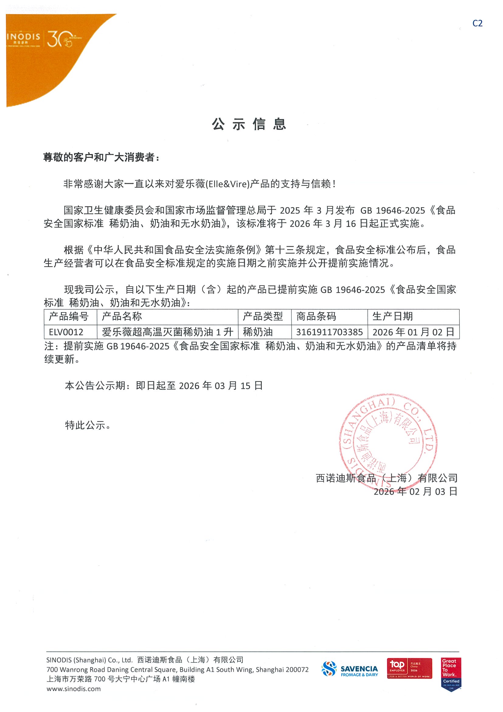 ELV0012爱乐薇超高温灭菌稀奶油1L提前实施GB19646-2025稀奶油新标准公示信息
