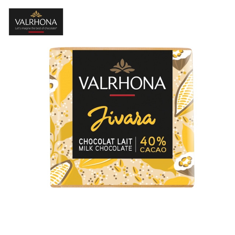 Valrhona composes chocolates of inimitable, constant flavor. This is the result of the way they blend luxury cocoas of different varieties and origins. A complex and precise process is used to bring out the very essence of each blend. Jivara has mellow vanila and malty cocoa-rich flavor.